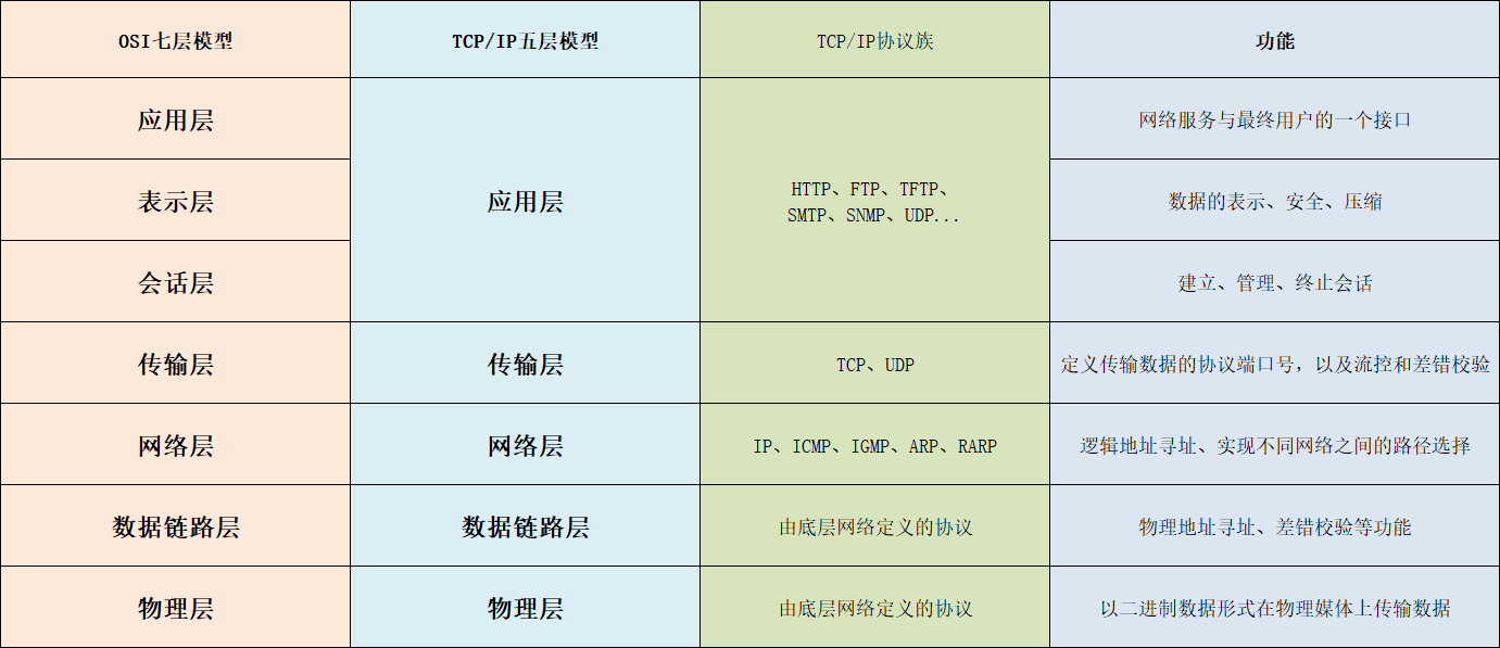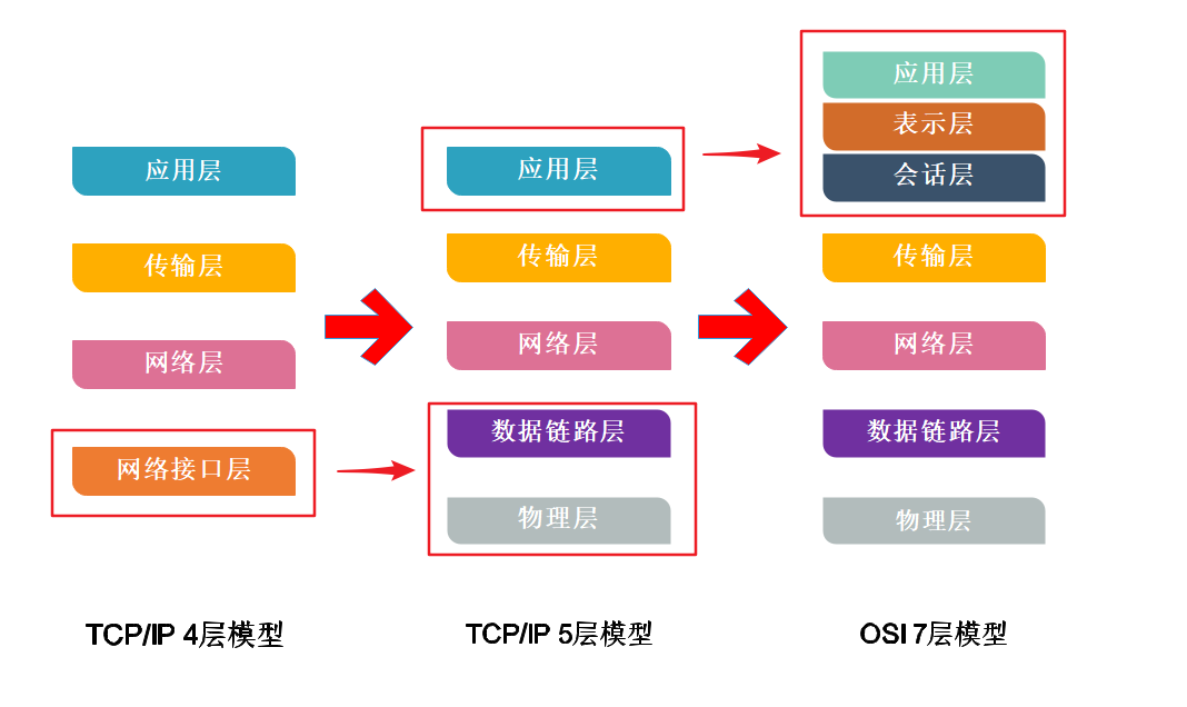 OSI模型和TCP/IP模型对比我们用图表的形式呈现,随着时代的发展,OSI模型逐渐被TCP/IP五层模型代替。
