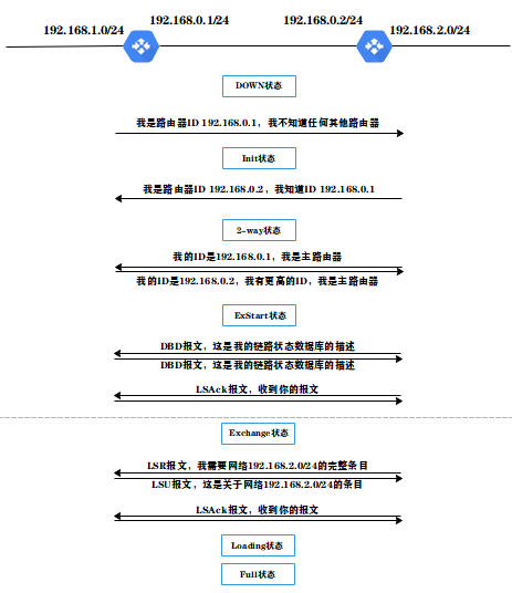 检查所有路由器的LSDB是否同步(数据库描述报文DBD):每个路由器都创建了由每个接口、对应的相邻节点和接口速度组成的数据库,链路状态数据库中每个条目称为LSA(链路状态通告),常见的有六种LSA类型