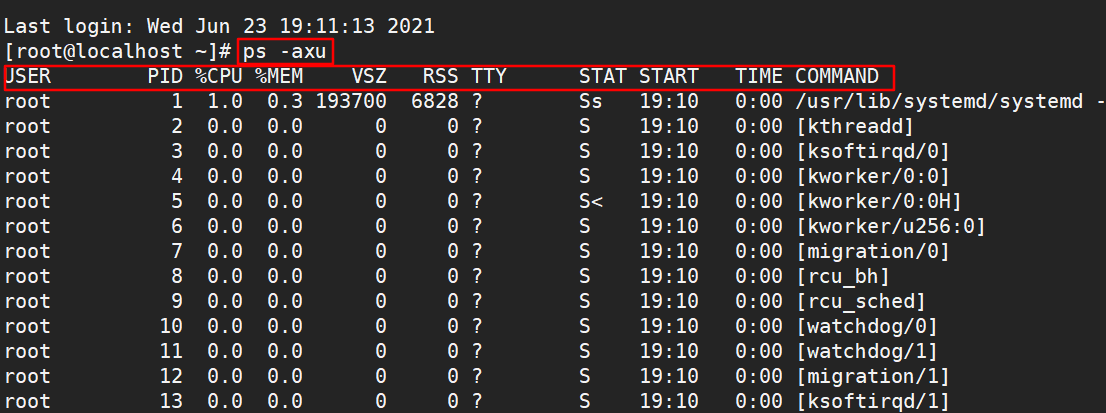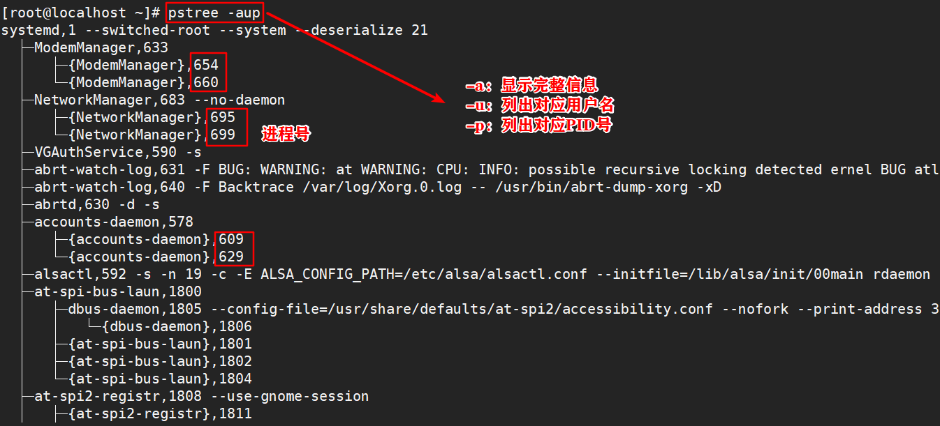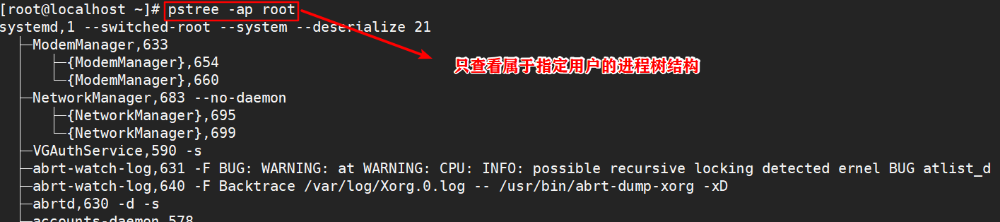 - pstree以树形结构来显示进程信息,罗列出来的信息很多,可以用相关常用选项来查找特定的信息。