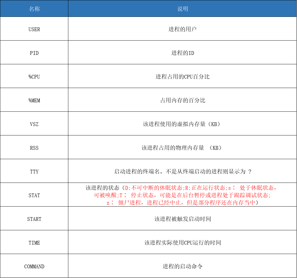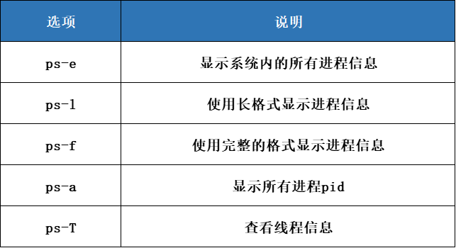- 查看进程的命令有ps、top、pgrep、pstree,其中ps命令是查看静态的进程信息,对应的常用选项有e、l、f、a、T (T查看线程)等。