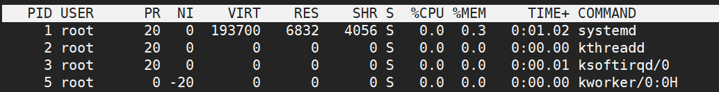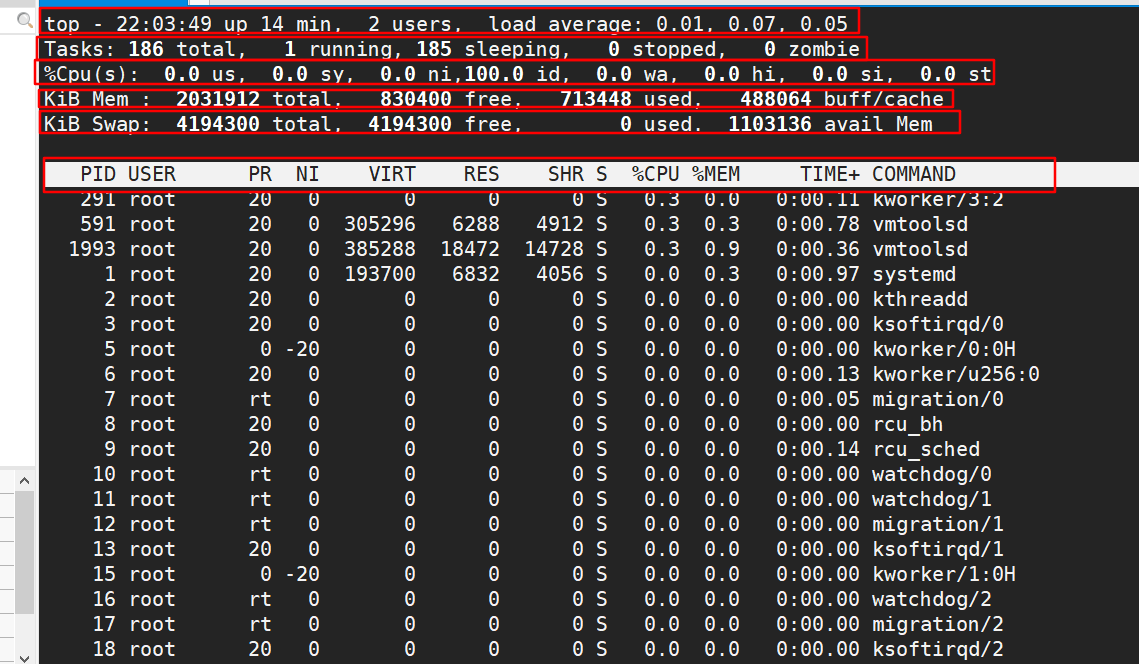 load average 0.00,0.03 0.05: 系统负载,即单位时间内系统处理的任务数,后面三个数值分别是1分钟、5分钟、15分钟到现在的平均值