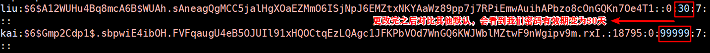 例如更改liu用户有效密码期为30天,更改完后进入shadow文件查看