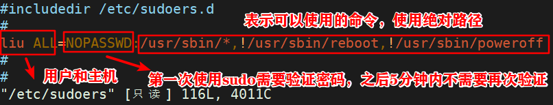 /etc/sudoers:此文件的默认权限是440,保存退出是必须执行“wq!”命令来强制操作