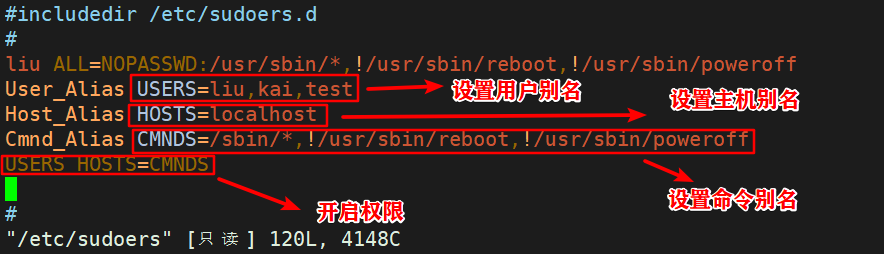 User_Alias(用户别名)、Host_Alias(主机别名)、Cmnd_Alias(命令别名) 来进行设置别名(别名必须为大写),可以实现批量设置