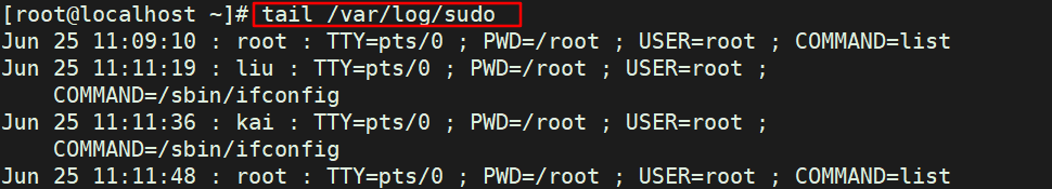 默认日志文件在/var/log/sudo中,启动日志配置以后,sudo操作过程才会被记录