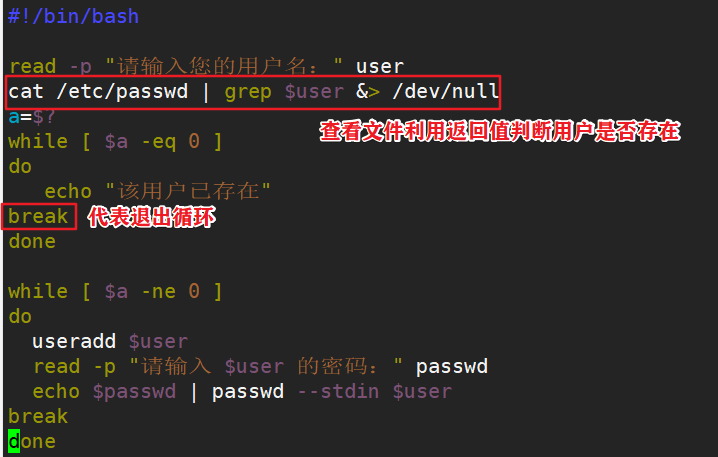 例题四:执行脚本输入用户名,若该用户存在,输出提示该用户已存在;若该用户不存在,提示用户输入密码,建立用户并设立其密码