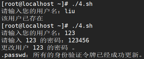 - 例题四:执行脚本输入用户名,若该用户存在,输出提示该用户已存在;若该用户不存在,提示用户输入密码,建立用户并设立其密码