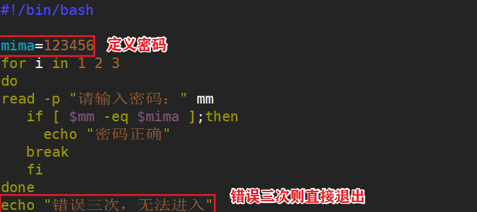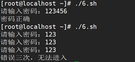 - 例题六:用户输入密码,脚本判断密码是否正确,输入正确提示正确信息,连续输错3次则报警