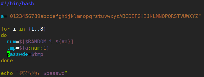 - 例题七:编写能够自动生成一个8位随机密码的脚本
