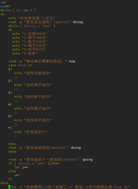 - 例题八:写个逛淘宝选购商品脚本,每家商店有五种商品选购(衣服500元,裤子400元,鞋子350元,帽子150元,袜子50元),每次选购完或不买都会提示用户是否继续逛下一家商店,如果不再继续逛的话进行购物车结算总额。