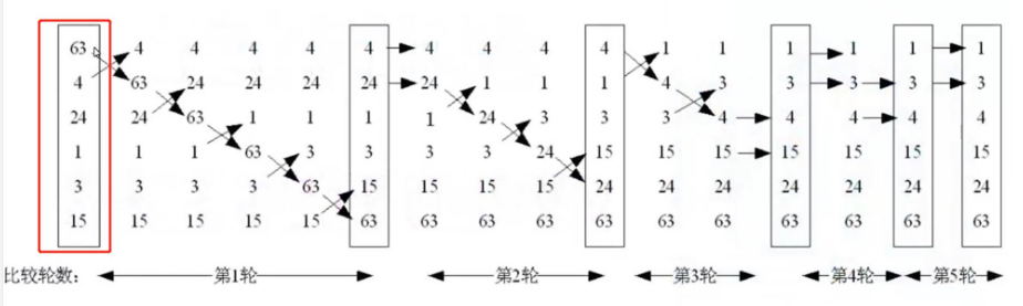 类似气泡上涌的动作,会将数据在数组中从小到大或者从大到小不断的向前移动。