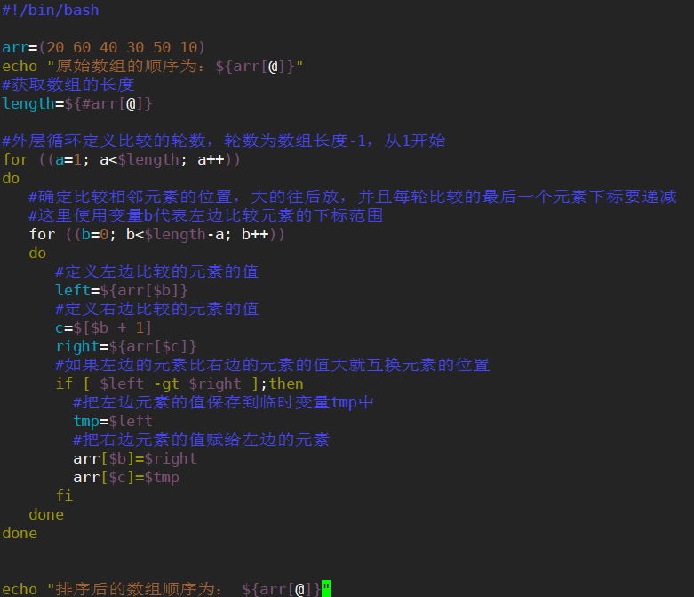 冒泡算法由双层循环实现,其中外部循环用于控制排序轮数,一般为要排序的数组长度减1次,因为最后一次循环只剩下一个数组元素,不需要对比,同时数组已经完成排序了。而内部循环主要用于对比数组中每个相邻元素的大小,以确定是否交换位置,对比和交换次数随排序轮数而减少。