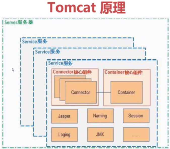 一个Tomcat中只有一个Server,一个Server可以包含多个Service,一个Service只有一个Container,但是可以有多个Cinnectors,因为一个服务器可以有多个连接,如同是提供http和htpp链接,也可以提供向相同协议不同端口的连接。