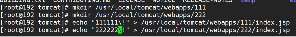 echo "1111111111\!" > /usr/local/tomcat/webapps/111/index.jsp