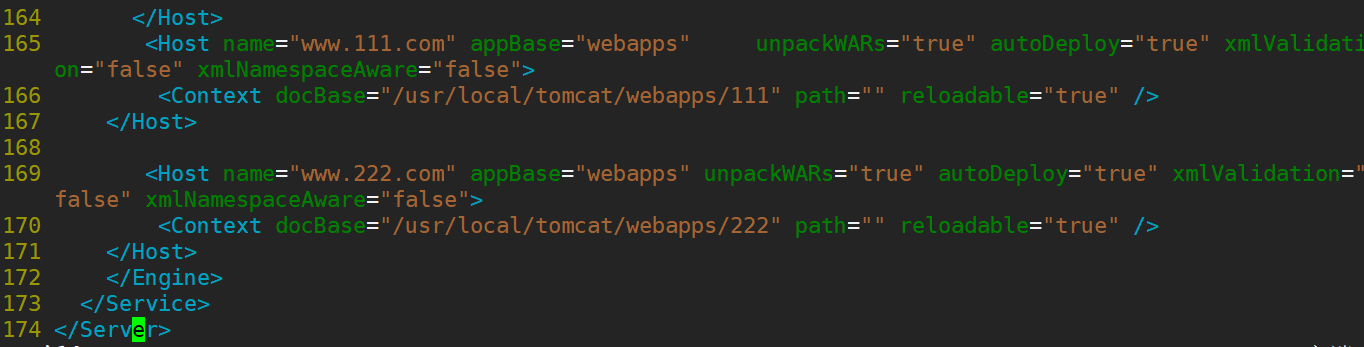 vim /usr/local/tomcat/conf/server.xml #165行前插入