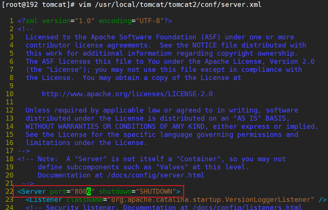 <Server port="8006" shutdown="SHUTDOWN"> #22行,修改Server port,默认为8005 -> 修改为8006
