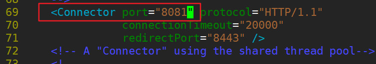 <Connector port="8081" protocol="HTTP/1.1" #69行,修改Connector port,HTTP/1.1 默认为8080 -> 修改为8081