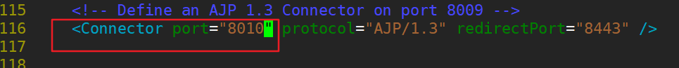 <Connector port="8010" protocol="AJP/1.3" redirectPort="8443" /> #116行,修改Connector port AJP/1.3,默认为8009 -> 修改为8010