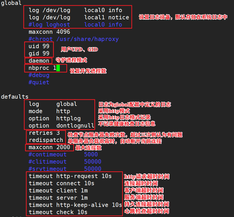 defaults #配置默认参数,可被用到Listen、frontend、backend组件