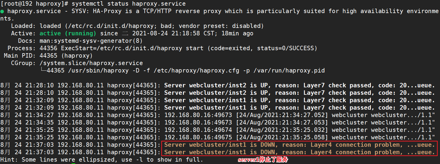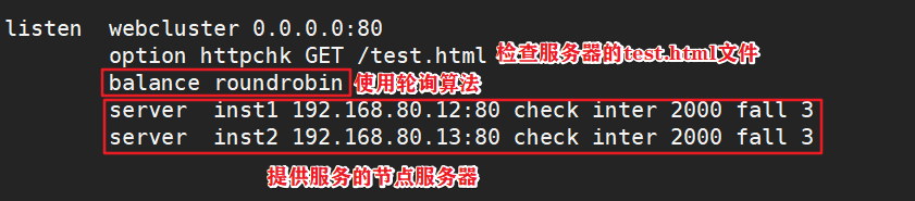 server inst1 192.168.80.12:80 check inter 2000 fall 3 #定义在线节点