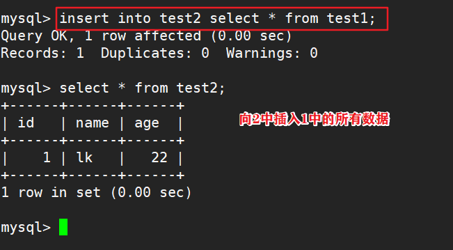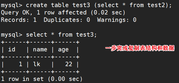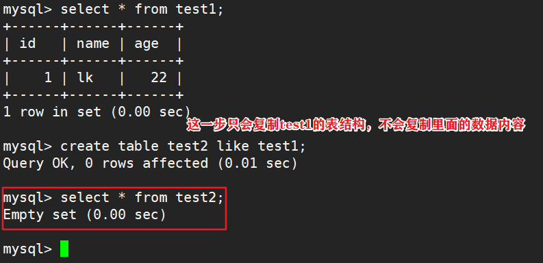 create table test1 like test2; #通过like方法,复制test1表结构生成test2表