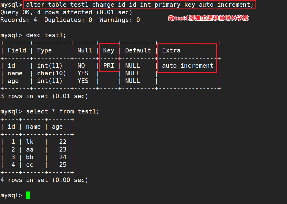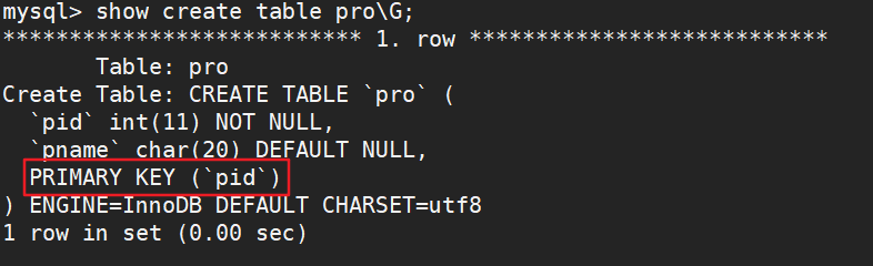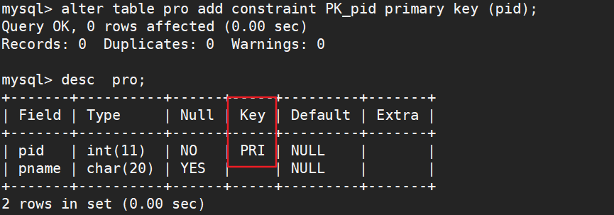 alter table pro add constraint PK_pid primary key (pid); #constraint PK_pid 添加主键名