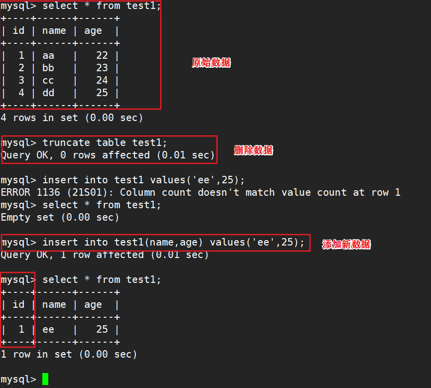 #truncate 清空表后,没有返回被删除的条目,truncate工作时是将表结构按原样重新建立,因此在速度上truncate会比delete清空快,是由truncate table清空表内数据后,ID会从1开始记录