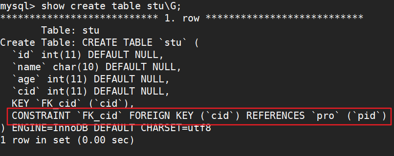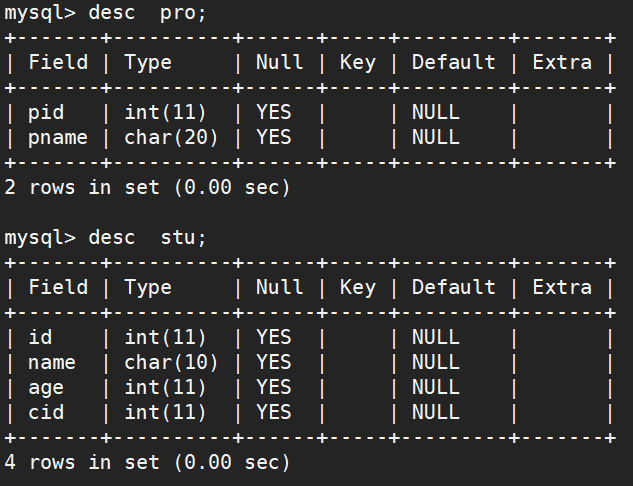 create table stu (id int,name char(10),age int,cid int); #外键表