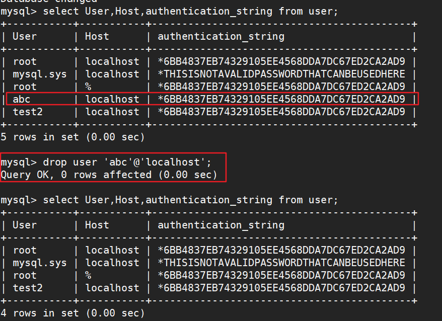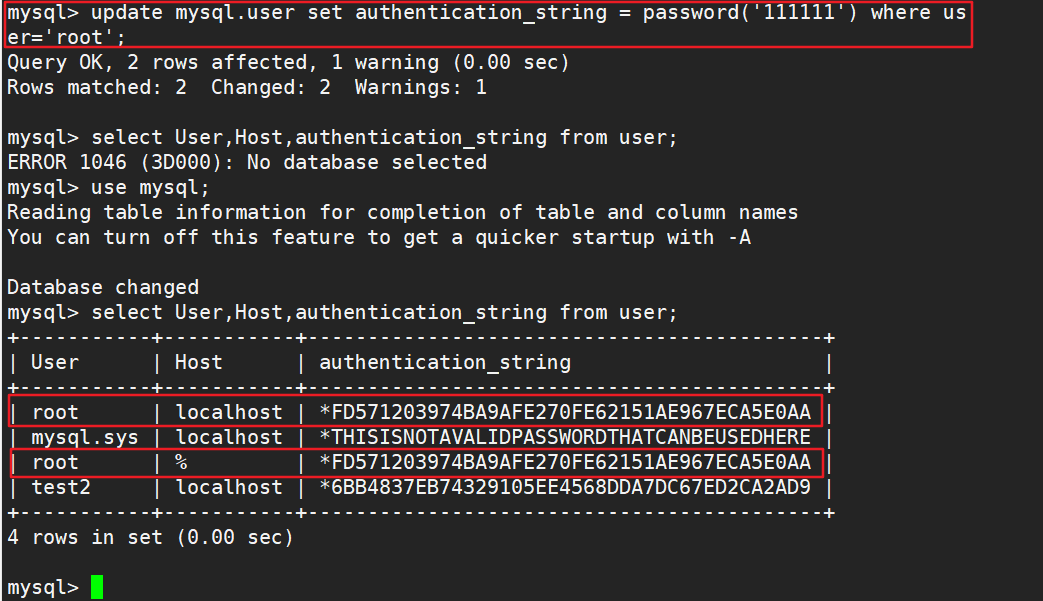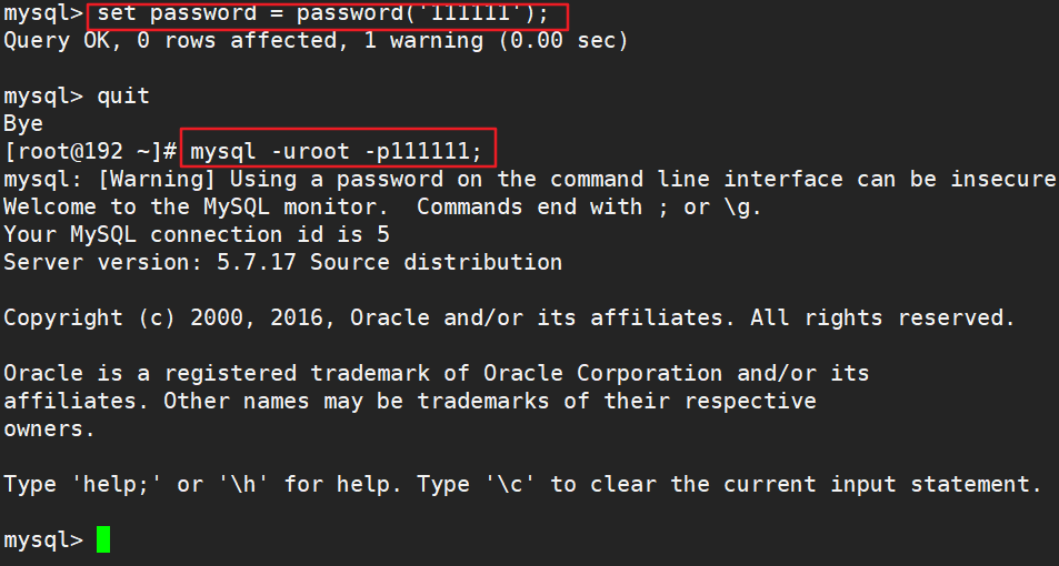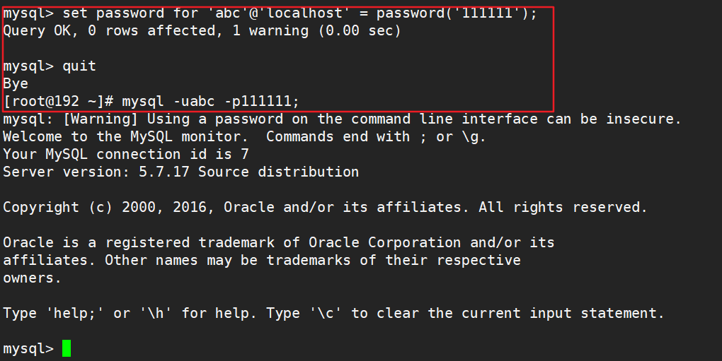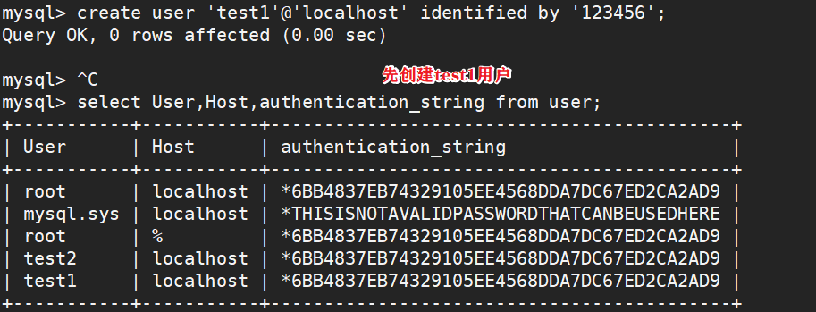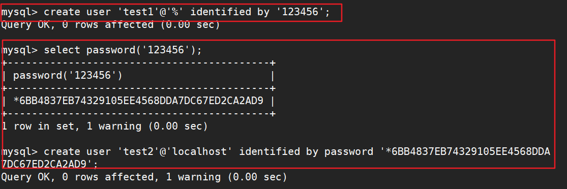 若使用加密密码,需要先使用select password('密码');获取密文,再在语句中添加password'密文';