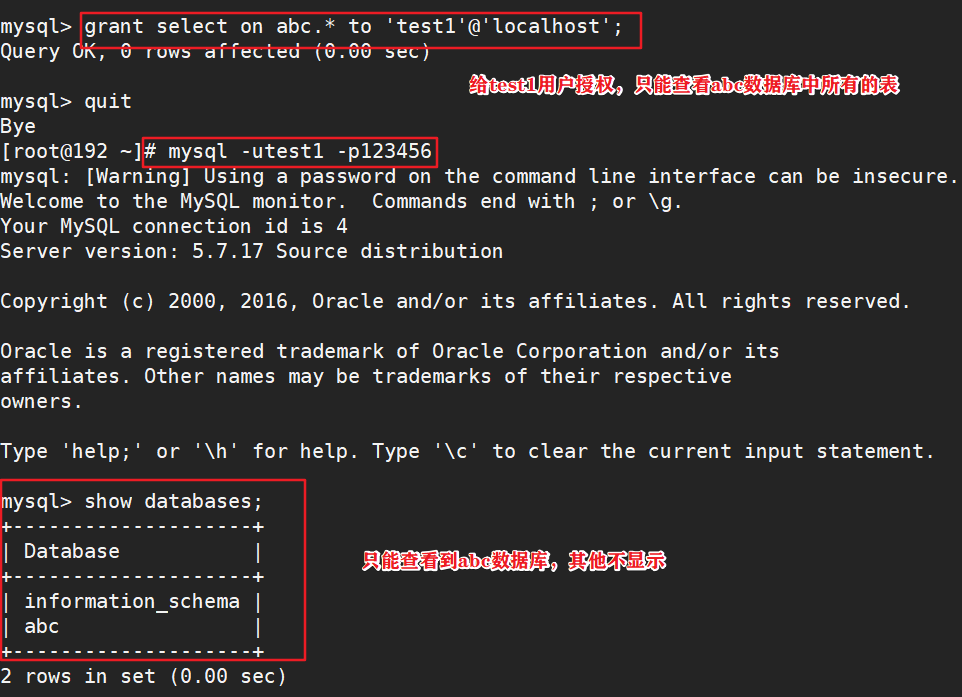 #权限列表:用于列出授权使用的各种数据库操作,以逗号进行分隔,如‘select,insert,update’。使用all表示所有权限,可授权执行任何操作