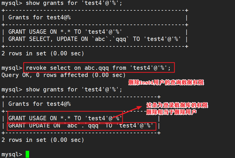 revoke 权限 on 数据库名.表名 from '用户名'@'来源地址';