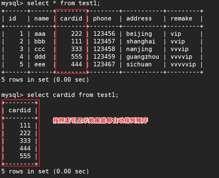 - 使用索引后可以不用扫描全表来定位某行的数据,而是先通过索引表找到该行数据对应的物理地址然后访问响应的数据,因此能加快数据库的查询速度