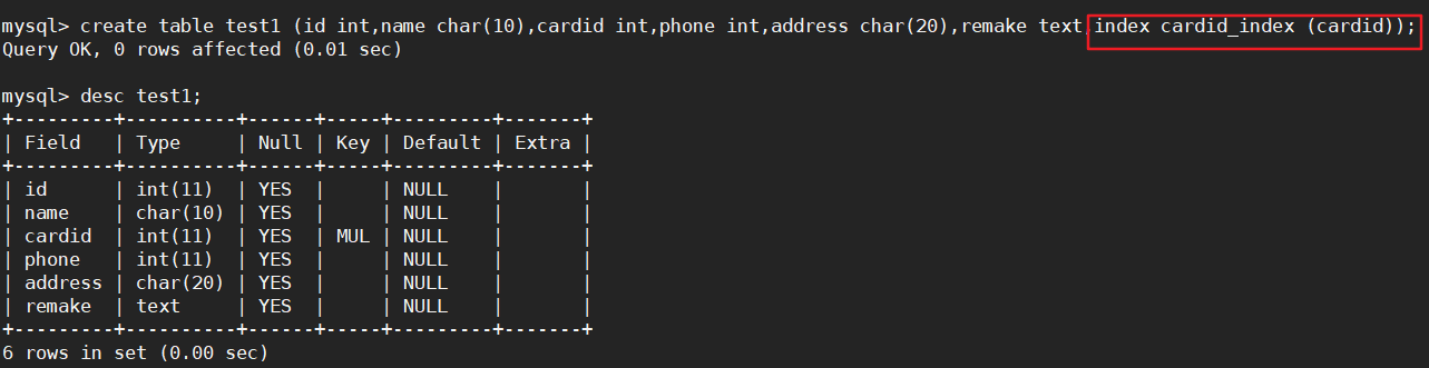 create table 表名 (字段1 数据类型,字段2 数据类型,index 索引名 (列名));