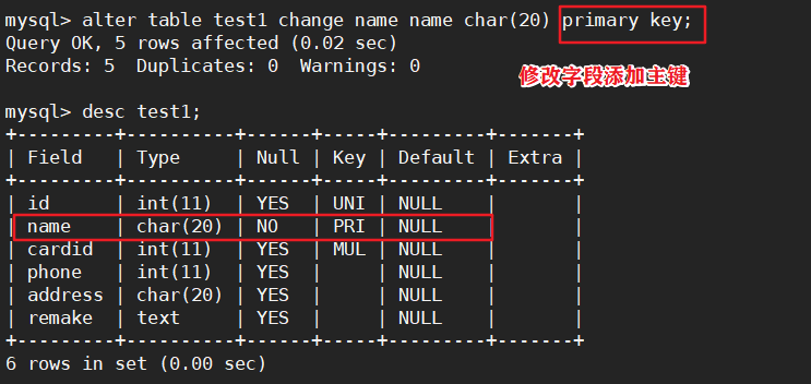 alter table 表名 change 旧列名 新列名 数据类型 primary key;