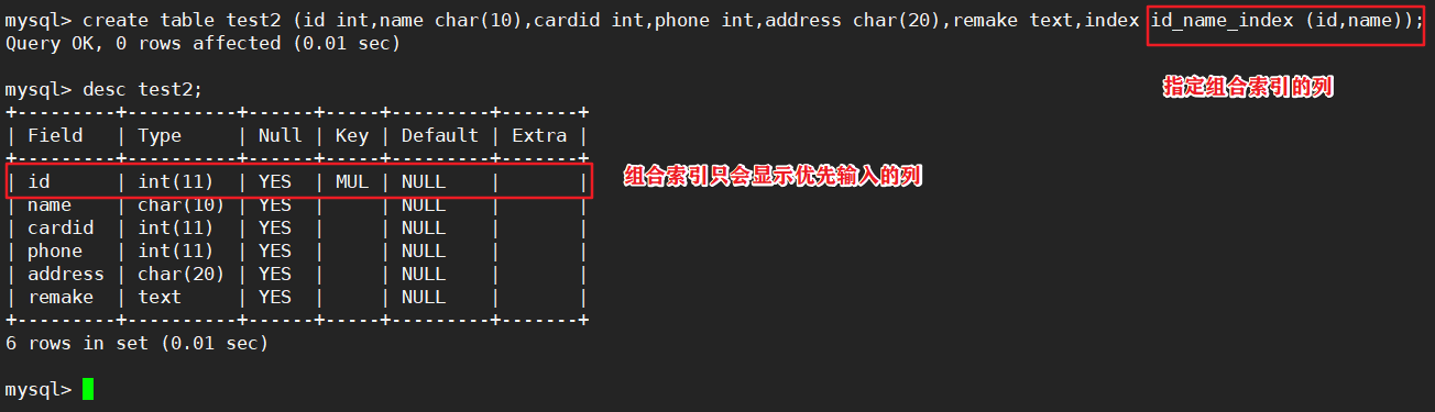 create table 表名 (字段1 数据类型,字段2 数据类型,index 索引名 (列名1,列名2));