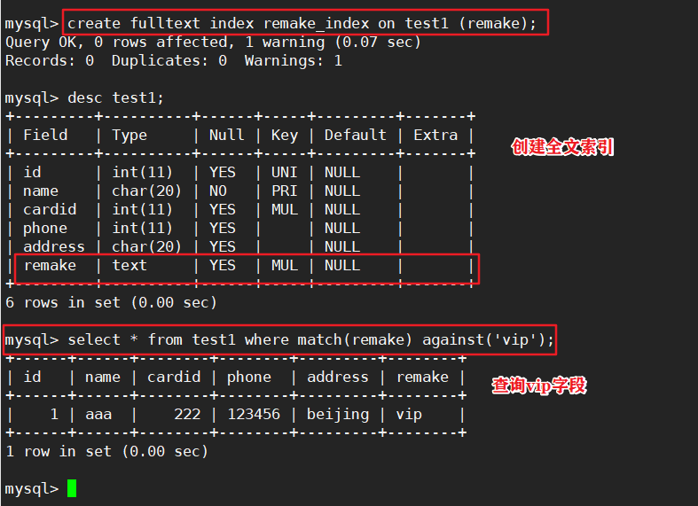 create fulltext index 索引名 on 表名 (列名);