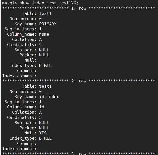 show index from 表名\G; 竖向显示表索引信息
