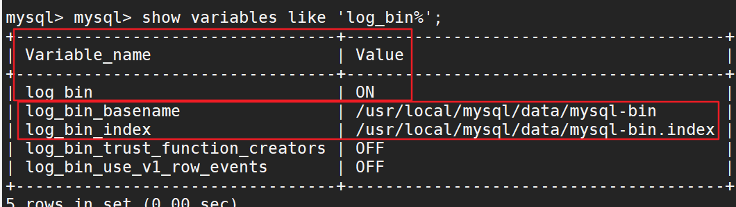 show variables like 'log_bin%'; #查看二进制日志是否开启