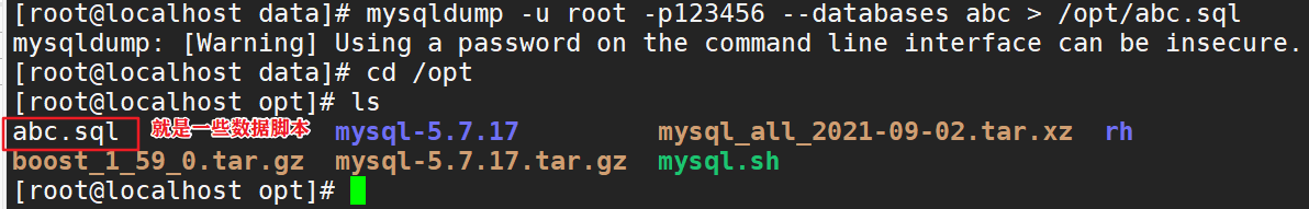 cp /usr/local/mysql/data/mysql—bin.000004 /opt/ #保存备份文件