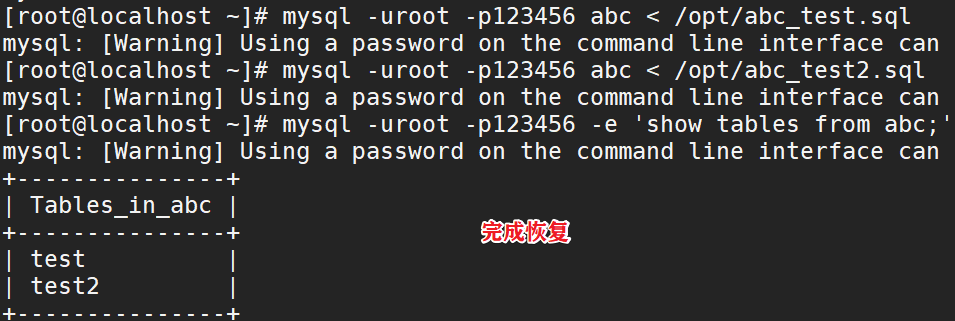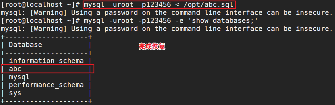 mysql -uroot -p[密码] < /备份路径/备份文件名.sql