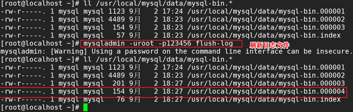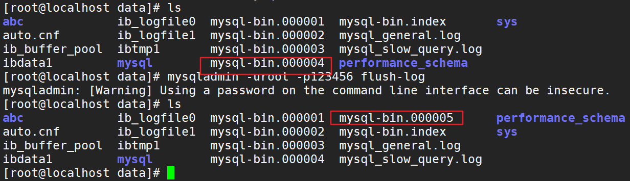 #之前的步骤操作会保存到mysql—bin.000004文件中,之后数据库数据再发生变化则保存在mysql—bin.000005中