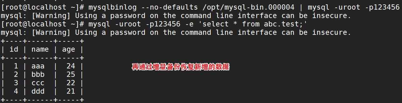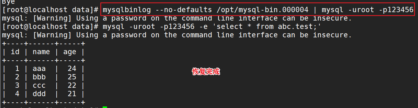 mysqlbinlog --no-defaults /opt/mysql—bin.000004 | mysql -uroot -p123456
