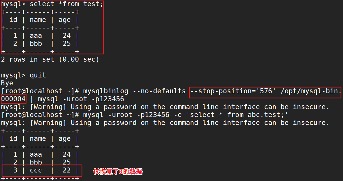 mysqlbinlog --no-defaults --stop-position='576' /opt/mysql—bin.000004 | mysql -uroot -p123456