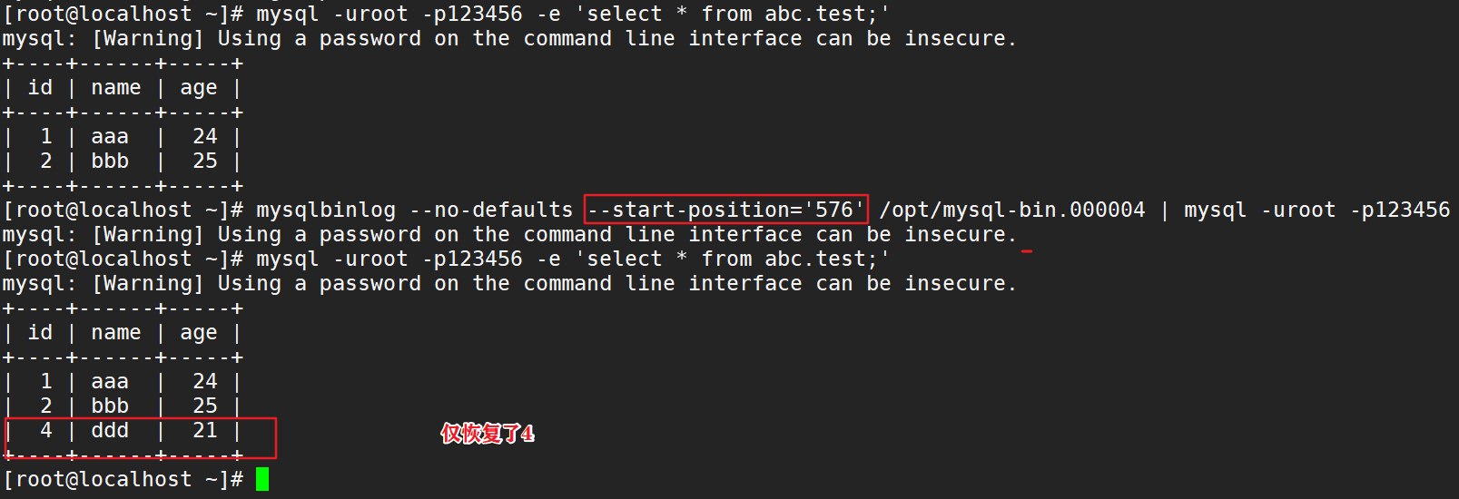 mysqlbinlog --no-defaults --start-position='576' /opt/mysql—bin.000004 | mysql -uroot -p123456