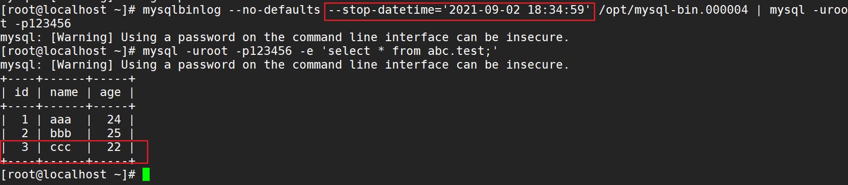 mysqlbinlog --no-defaults --start-datetime='2021-09-02 18:34:59' /opt/mysql—bin.000004 | mysql -uroot -p123456