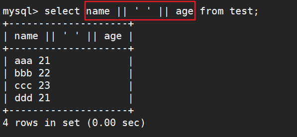 #如sql_mode开启了PIPES_AS_CONCAT, "||"视为字符串的连接操作符而非或运算符,和字符串的拼接函数concat相类似,这和oracle数据库的使用方法是一样的