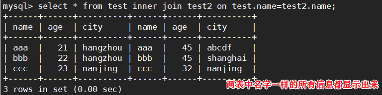 select 相同字段 from 表名1 inner join 表名2 on 表名1.相同字段=表名2.相同字段;