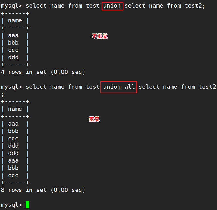 union:生成结果的资料值将没有重复,且按照字段的顺序进行排序