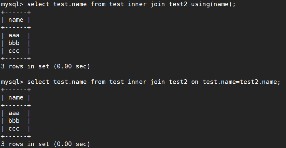 select 相同字段 from 表名1 inner join 表名2 using (相同字段);
