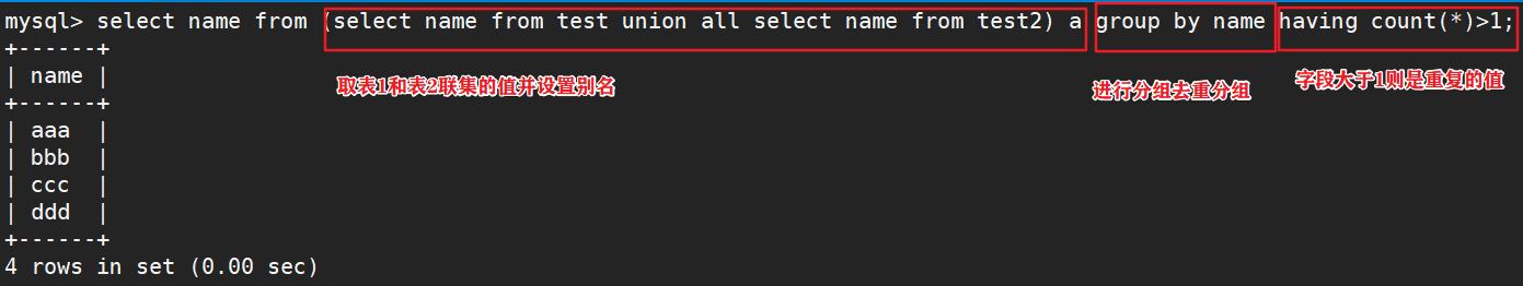 (select 相同字段 from 表格1 union all select 相同字段 from 表格2) 别名 group by 别名.相同字段 having count(*) > 1;